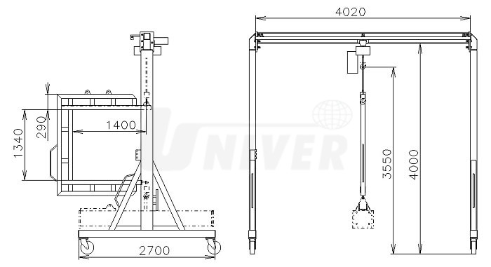s ručním kladkostrojem a ručním pojezdem, nosnost 1000 kg, světlá šířka 3000 mm, celková výška 3500 mm.