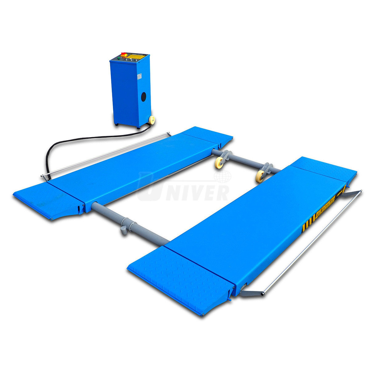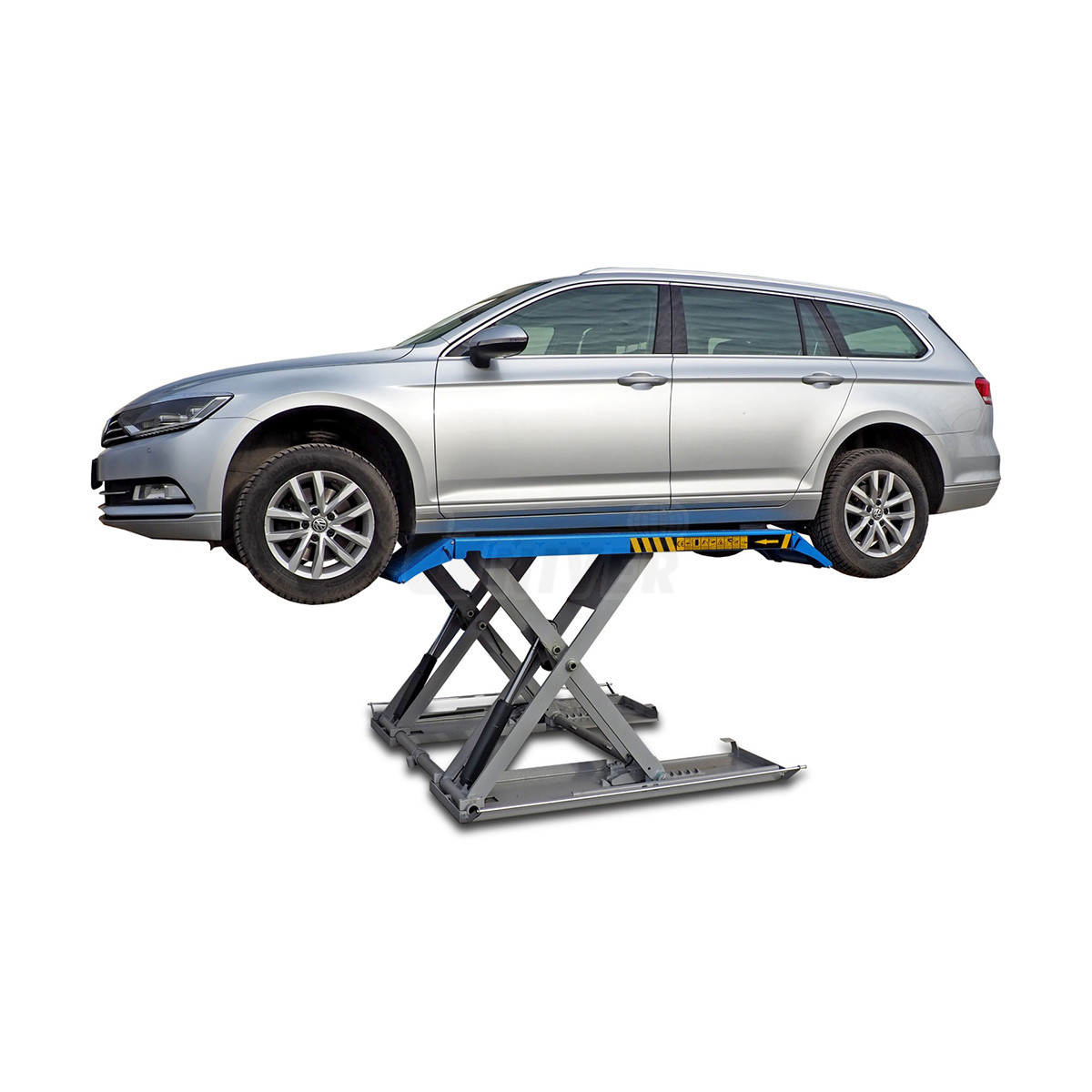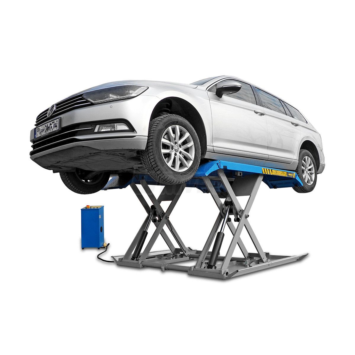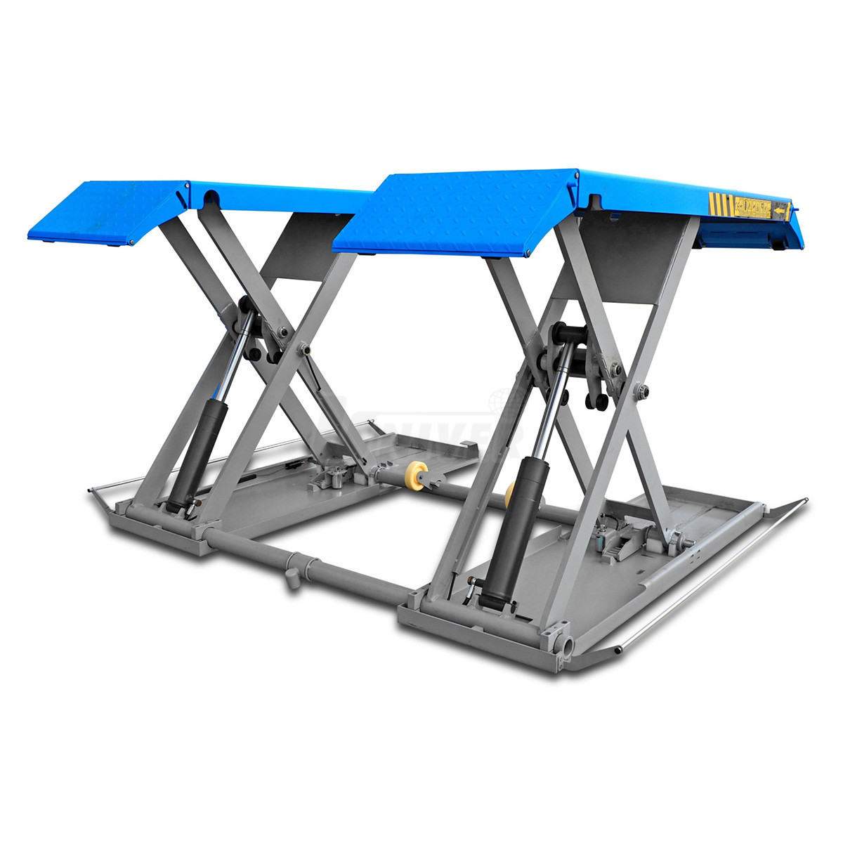 zdvihák má dva spodné rámy, ktoré sú na podlahe, nožnicovú zdvíhaciu konštrukciu s dvoma hydraulickými jednotkami, dve nosné plošiny a oddelenú pojazdnú ovládaciu jednotku / skriňu s ovládacím panelom, obe plošiny majú na oboch koncoch nájazdové plošinky