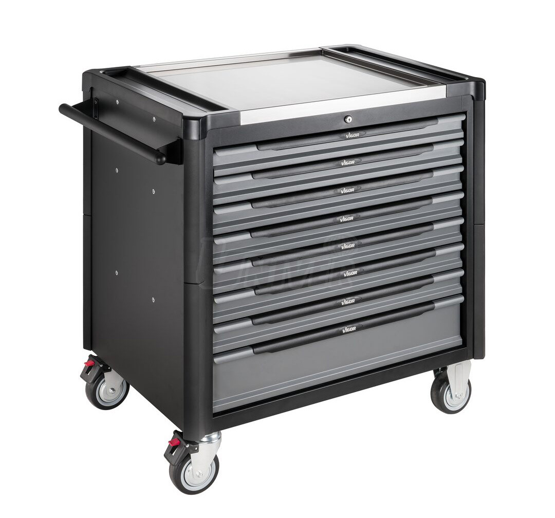 Montážní vozík se 775-dílnou sadou ručního nářadí rozdělenou do 14 modulů má 8 zásuvek (1 vysokou a 7 nízkých) a nerezovou pracovní desku.- 14 modulů (VIGOR V6821 / V6822 / V6807 / V 6808 / V6809 / V6810 / V6811 / V6812 / V6813 / V6814 / V6815 / V6816 / V6817 / V6818) s ručním nářadím (775 ks), jde o sady ráčen, nástrčných klíčů a bitů 1/4", 3/8" a 1/2" / 4 až 32 mm, otevřených, očkoplochých a vyhnutých očkových klíčů (6 až 36 mm), šroubováků, kleští, sekáčů, vyrážečů, ale také o kladivo, ocelovou palici, momentový klíč, pneumatický utahovák atd.
