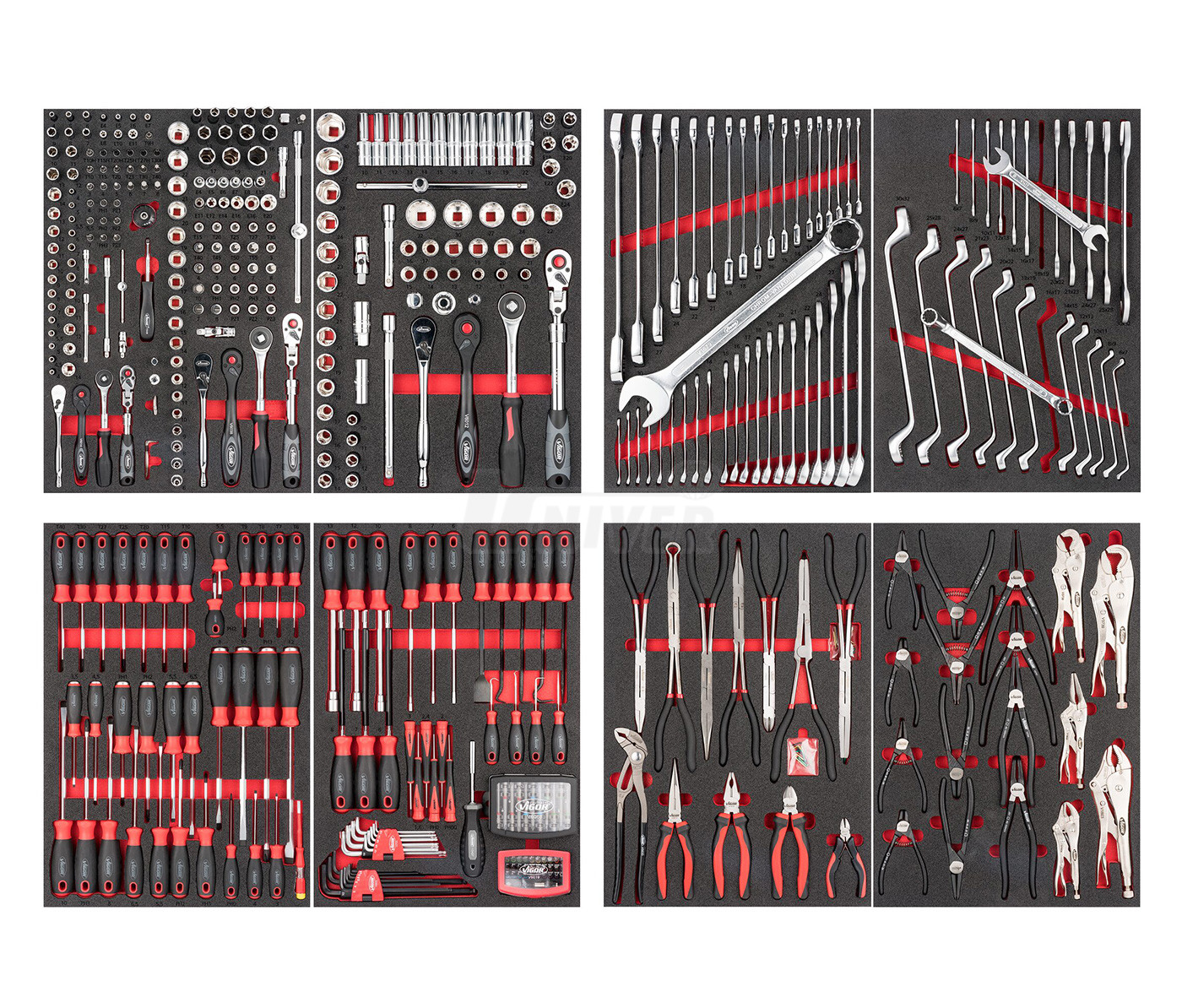 Extra hluboký montážní vozík s 469-dílnou sadou ručního nářadí rozdělenou do 8 modulů má 8 zásuvek (1 vysokou a 7 nízkých) a nerezovou pracovní desku.- 8 modulů (VIGOR V6821 / V6822 / V6807 / V 6808 / V6813 / V6814 / V6815 / V6816) s ručním nářadím (469 ks), jde o sady ráčen, nástrčných klíčů a bitů 1/4", 3/8" a 1/2" / 4 až 32 mm, otevřených, očkoplochých a vyhnutých očkových klíčů (6 až 36 mm), šroubováků, kleští, sekáčů, vyrážečů, ale také o kladivo, ocelovou palici atd.