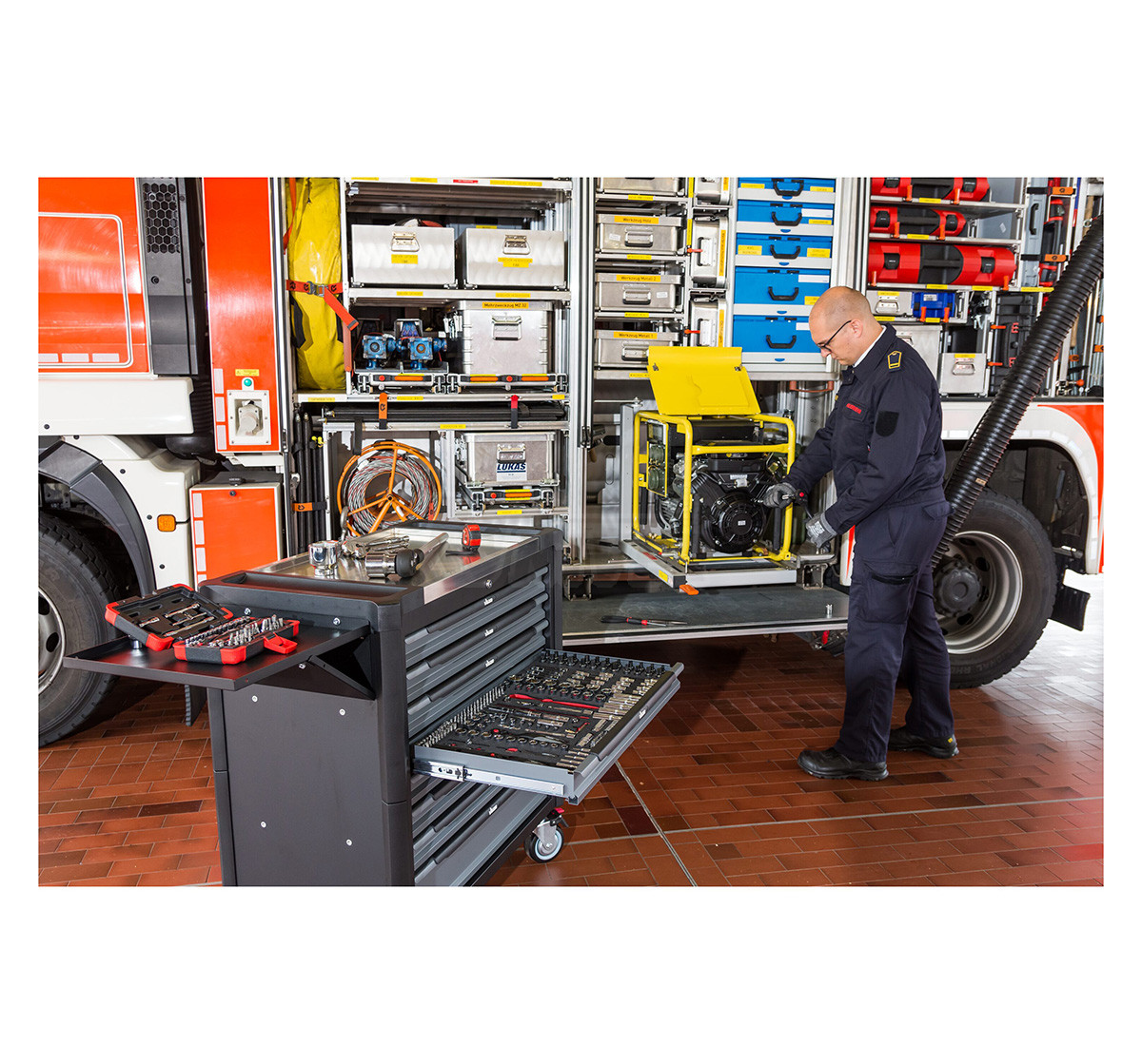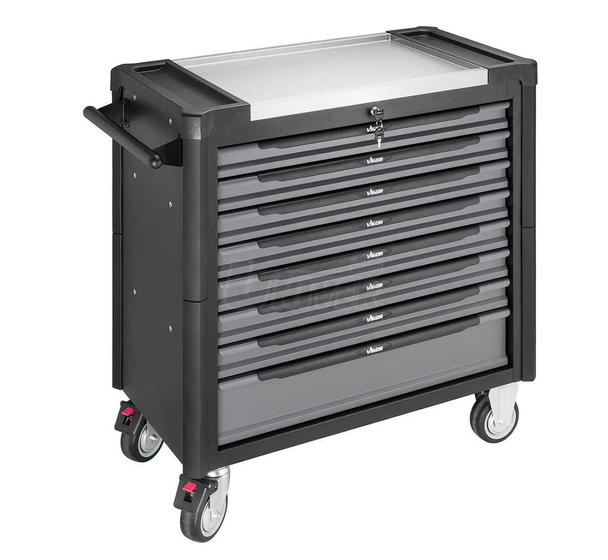 Montážní vozík s 499-dílnou sadou ručního nářadí rozdělenou do 21 modulů má 8 zásuvek (1 vysokou a 7 nízkých) a nerezovou pracovní desku.- 21 modulů (VIGOR V4971 / V4973 / V4975 / V7323 / V4727 / V5602 / V5006 / V5017 / V5070 / V5072 / V4979 / V4985 / V4987 / V4981 / V5170 / V4729 / V5075 / V5633 / V4995 / V4999 / V5004) s ručním nářadím (499 ks), jde o sady ráčen, nástrčných klíčů a bitů 1/4", 3/8" a 1/2" / 4 až 32 mm, otevřených, očkoplochých a vyhnutých očkových klíčů (6 až 36 mm), šroubováků, kleští, sekáčů, vyrážečů, ale také o kladivo, ocelovou palici atd.