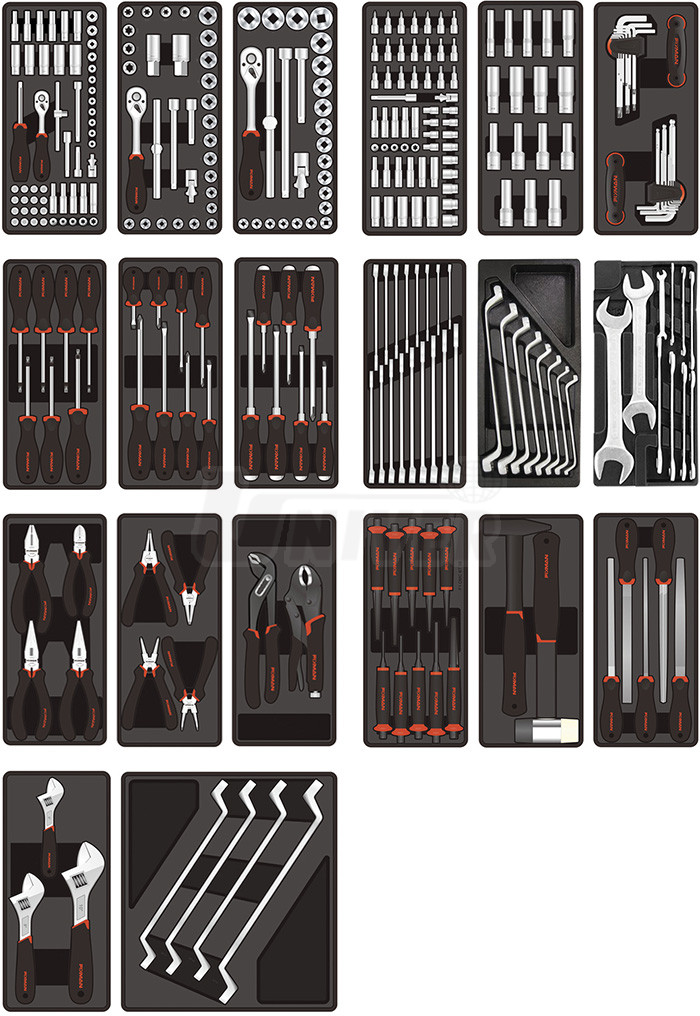 Exkluzivní typ kvalitního montážního vozíku v provedení F1 series Professional s 297 ks nářadí. Má 8 zásuvek (6 nižších, 2 vyšší) uložených v teleskopických kolejnicích s kuličkovými ložisky, bezpečnostní uzamykací systém, aluminiová držadla zásuvek s popiskovými lištami a s automatickou západkou proti samovolnému otevření zásuvky, měkké obložení držadel integrovaných do horní plastové pracovní desky se zvýšenými okraji, speciální plastové ochrany všech 4 rohů proti poškození při nárazu a 4 kolečka Ø 125 mm (2 pevná, 2 otočná s poziční brzdou) pro vysoké namáhání (kategorie Heavy Duty). V 7 vrchních zásuvkách (6 nižších a 1 vyšší) jsou umístěny moduly s profesionálním nářadím vysoké kvality (chrom-vanadium a speciální oceli) a poslední 8.zásuvka (spodní vyšší) je prázdná.1.zásuvka - moduly: