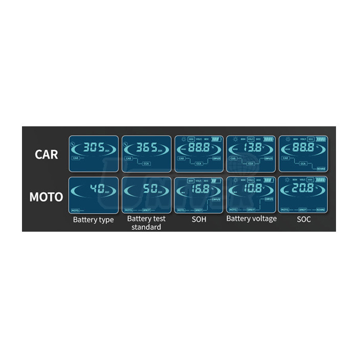 2 režimy CAR (pre batérie s vyznačenou kapacitou nad 20 Ah) a MOTO (pre batérie s vyznačenou kapacitou pod 20 Ah):