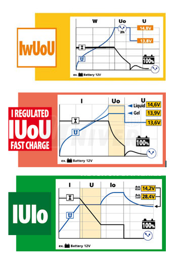- díky elektronické regulaci s nabíjecí charakteristikou konstantního napětí IwUoU (u trakčních baterií IUIo) je umožněné plné 100 % nabití baterií, standardní nabíječky s charakteristikou W2 nebo U nabijí často baterie jen na 90 %