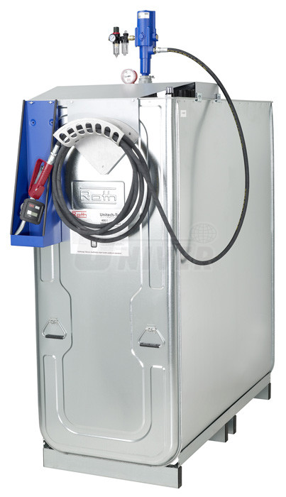 Dvouplášťová stacionární nádrž 1500 l na oleje s pneumatickým čerpadlem 3:1, s výdejní hadicí 8 m a s výdejní pistolí s digitálním průtokoměrem.- dvouplášťová stacionární nádrž o objemu 1500 l (45 105)
