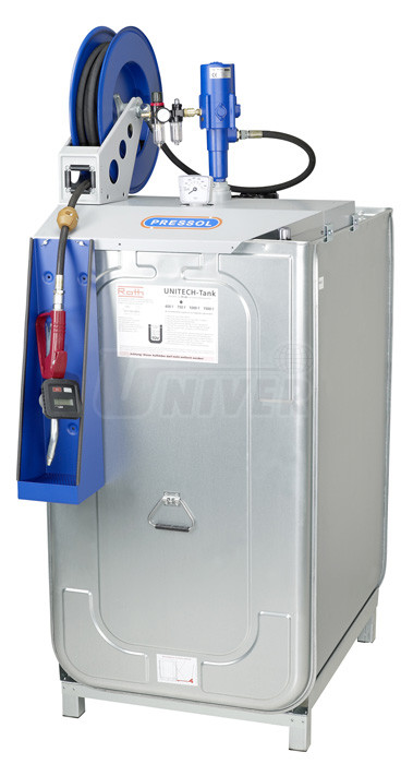 Dvouplášťová stacionární nádrž 750 l na čerstvé / nové oleje a oleje těžko vznítitelné s pneumatickým čerpadlem 3:1, s navijákem, výdejní hadicí 10 m a s výdejní pistolí s digitálním průtokoměrem.- dvouplášťová stacionární nádrž o objemu 750 l (45 101)