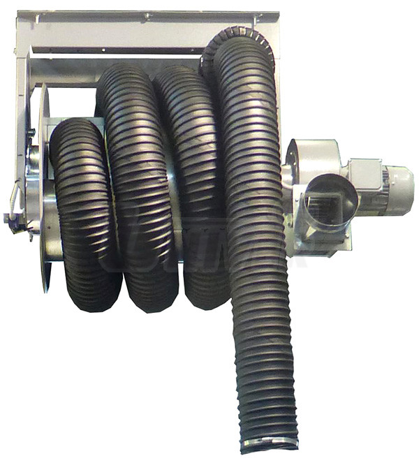 Automatické navijáky pro hadice odsávání výfukových plynů Ø 75 až 150 mm v délkách 7,5 až 15 m s pružinovým pohonem a ventilátorem.- přímo na naviják je instalovaný ventilátor pro odsávání výfukových plynů a jejich odvádění do venkovního prostoru, ovládá se spínačem nebo mikrospínačem a dodává se s třmenem pro snadnou montáž na pilíř nebo nenosnou zeď