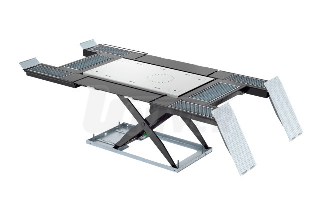 Pneumatický zvedák o nosnosti 3,5 t a výšce zdvihu 1310 mm s plošinami pro zvedání automobilů za kola je určený pro umístění na podlahu.