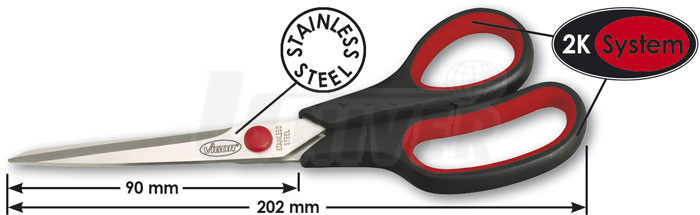 Univerzální nůžky mají stříhací část dlouhou 90 mm, celková délka nůžek je 202 mm. Nůžky jsou zhotoveny ze speciální oceli a mají dlouhou životnost. Ergonomické držení nůžek podporuje dvoukomponentní plastový kryt.