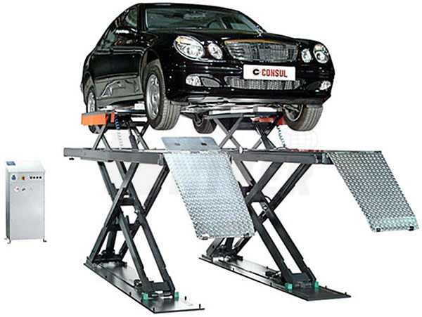Nůžkový elektrohydraulický plošinový zvedák (3,5 t) s plošinami (4560 mm) a s přídavným oboustranným nůžkovým zvedákem.- instalace na podlahu nebo s použitím přejezdových klapek i do úrovně podlahy