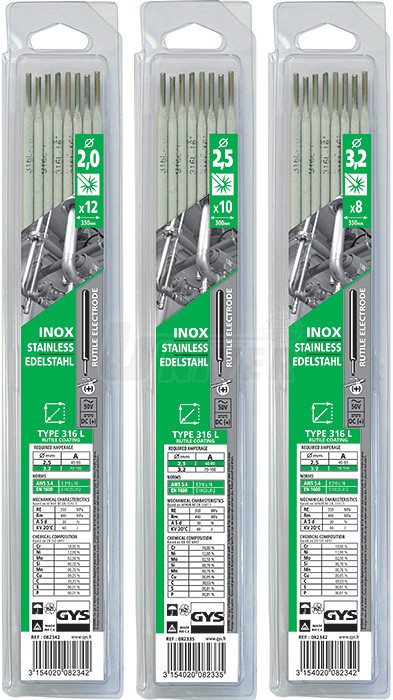 Vysoce kvalitní obalované svářecí elektrody se používají pro svařování nejrozšířenějších typů nerezových ocelí jako například 316 L, ale i 304, 308, 188 a 1883, z nichž jsou různá potrubí, nádrže apod. Mají vynikající charakteristiku hladkých, bezstruskových svárů.Dodavatel: GYS / Francie