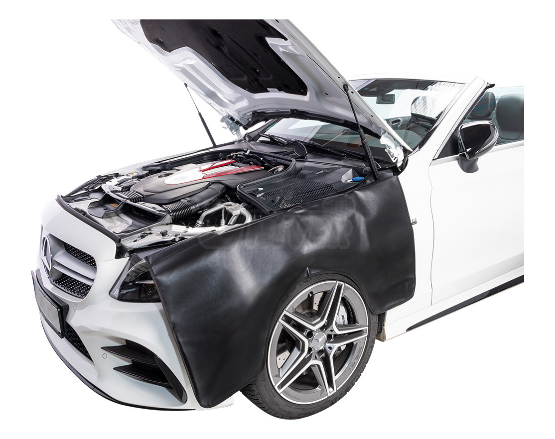 Koženkové ochranné přehozy na přední blatník s plochými pásovými magnety nebo pískovým závažím.- barva: černá (bez potisku)