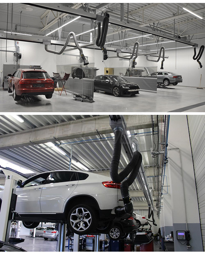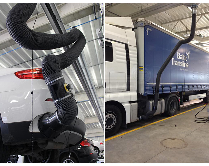 - použití ramen TOUCHLESS je nezávislé na rozměrech a pozici výfukové roury, odsávací trychtýř vždy dosáhne ke koncovce výfuku, umožňuje to také odsávání výfukových plynů od vozidla zvednutého na zvedáku