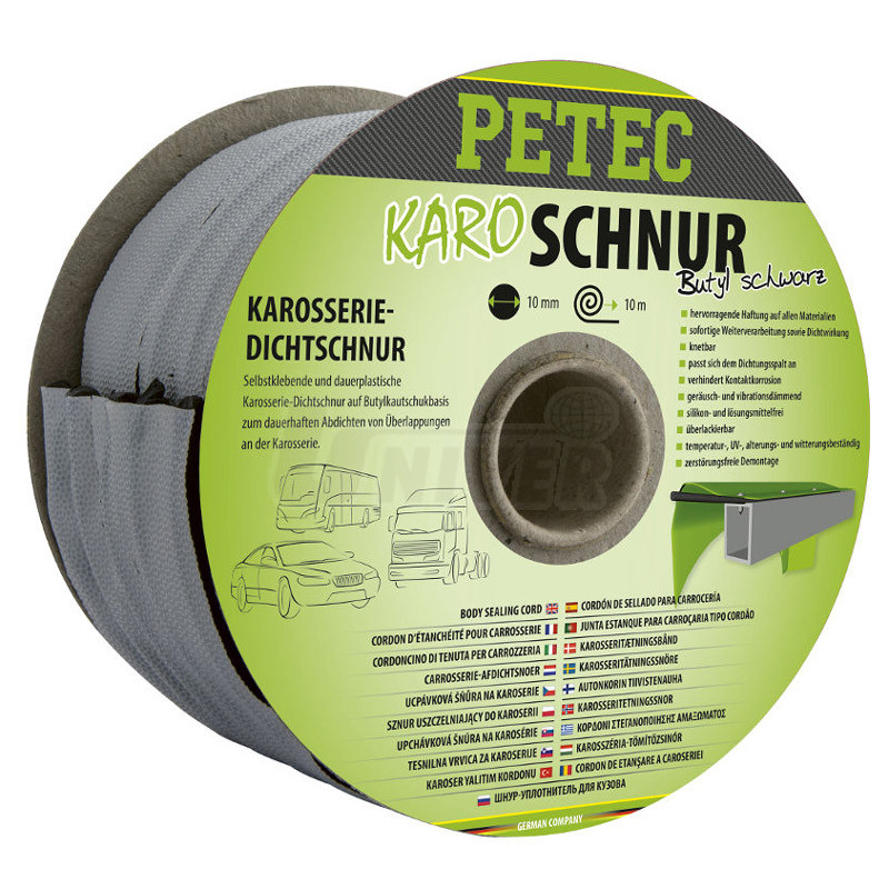 Samolepicí, trvale pružná, těsnicí karosářská šňůra Ø 10 mm na butylkaučukové bázi pro dlouhodobé utěsnění spár, dutin a přeplátování zejména na karosériích.- těsnění spár, dutin, falců, svárů, přeplátovaných plechů karoserií a další plechových dílů (např. blatníků, zadních světel, kabelových prostupů, střešních oken, ochranných a ozdobných lišt, světlometů, brzdových a zpětných světel, spojlerů, dveřních čalounění apod.) proti vlhkosti, prachu a průvanu