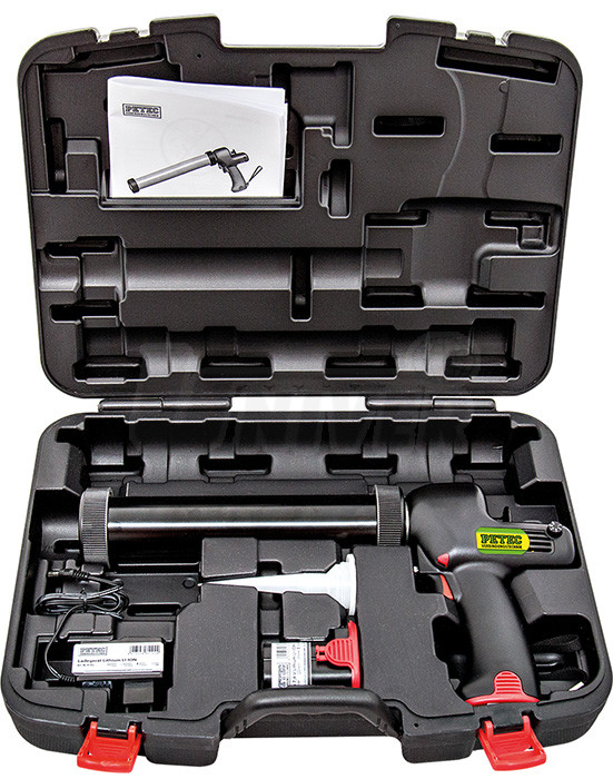 Profesionální akumulátorová vytlačovací pistole pro kartuše a sáčky/"šišky" v kufříku z umělé hmoty.- pro kartuše 290 ml / 310 ml nebo sáčky až 400 ml