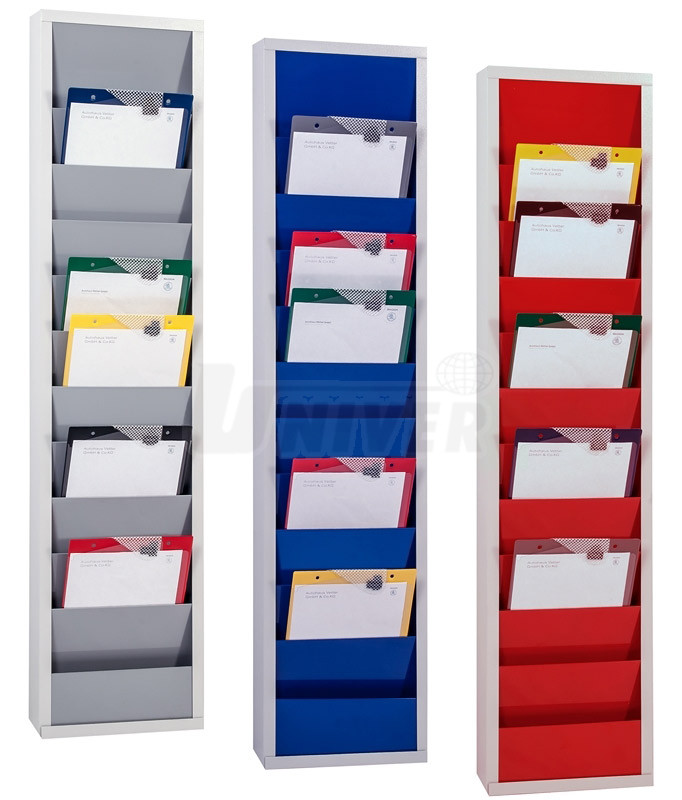 Plánovací tabule pro dokumenty formátu A4 s jednotnou šířkou 315 mm i výškou 1280 mm, s 10 přihrádkami, v červené, modré a šedé barvě.- 3 různě barevné kovové plánovací tabule jednořadé pro dokumenty formátu A4 (desky na zakázky, zástrčné karty atd.)
