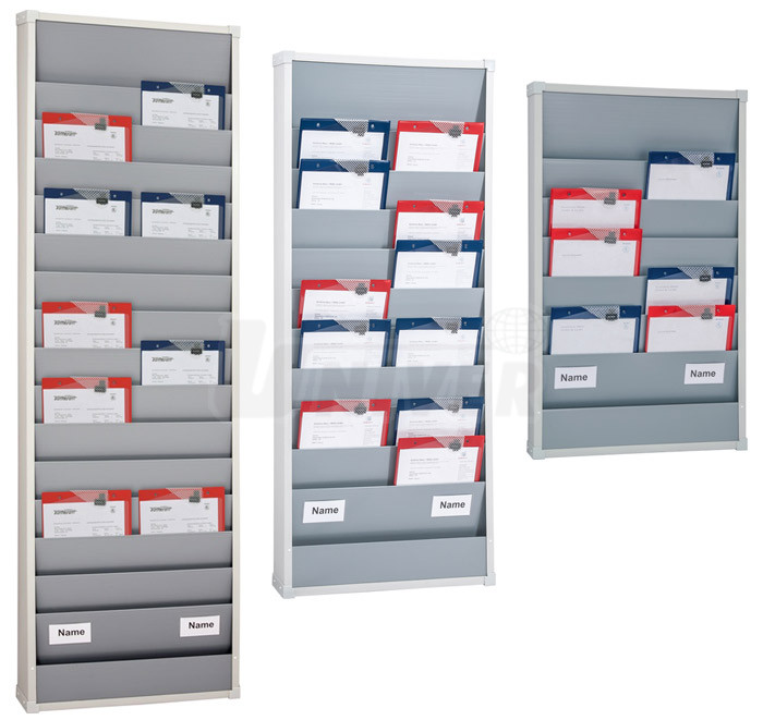 Plánovací tabule pro dokumenty formátu A4 s jednotnou šířkou 554 mm, ve 3 výškách a s počtem přihrádek 6, 10 nebo 15.- 3 různě velké plánovací tabule ze speciální umělé hmoty pro dokumenty formátu A4 (desky na zakázky, zástrčné karty atd.)