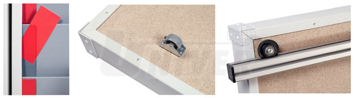 - jednotlivé tabule / moduly jsou opatřeny 2 kolečky pro zavěšení a pohyb po stěnové kolejnici a 1 kolečkem pro udržování mezery od stěny