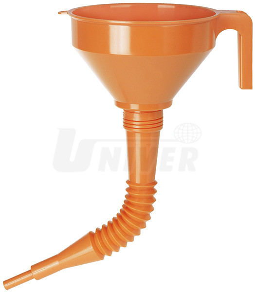 Kvalitní plastový trychtýř s vyšším límcem, držadlem se závěsným očkem a oddělitelným dvoustupňovým pružným výtokovým nástavcem. Dobře odolává olejům, kyselinám, pohonným hmotám a prasknutí. Nemá vnitřní sítko, ale lze ho doplnit jako příslušenství.Použití: průmysl, řemeslná výroba, dílny apod.