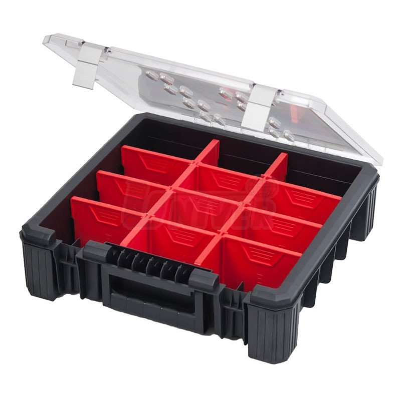 Profesionální plastový organizér se zvýšenou odolností s 12 přestavitelnými přihrádkami s průhledným víkem a s integrovaným držadlem.- profesionální organizér s přestavitelnými plastovými přepážkami
