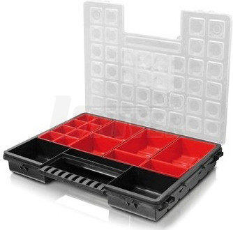 organizér z odolného plastu se 14 přestavitelnými plastovými boxy 4 různých velikostí s průhledným víkem a s integrovaným držadlem.- profesionální organizér s vyjímatelnými plastovými boxy
