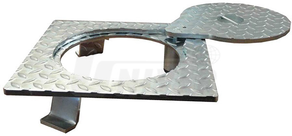2 přejezdné podlahové uzávěry různých rozměrů z robustního ocelového plechu se speciálním zinkováním zajišťujícím dlouhodobou odolnost proti korozi s oválným otvorem a otočným víčkem.