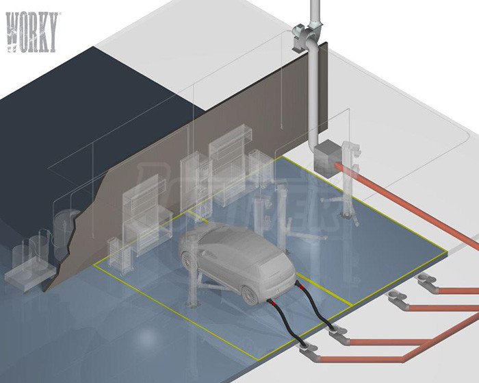 - rozvod odsávání k jednotlivým stáním na dílně je veden pod podlahou, a to např. spirálně vinutými SPIRO rourami z pozinkovaného plechu, příp. glazovanými kameninovými kanalizačními rourami, které jsou poměrně levné a velmi dobře odolávají agresivní plynům i kondenzátu, hlavní větve se pokládají ve spádu cca 2 %