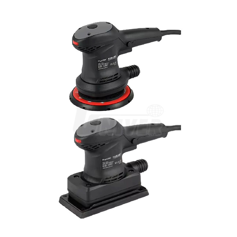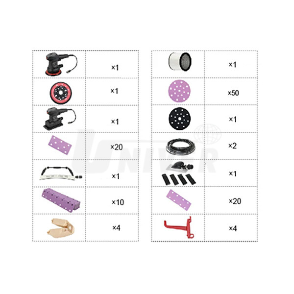 - 2 profesionálne elektrické brúsky (kruhová orbitálna ø 150 mm, obdĺžniková 70 x 198 mm), otáčky naprázdno 4000 - 10000 ot/min, excentricita 3/5 mm, hmotnosť 1,7 kg / 3,2 kg