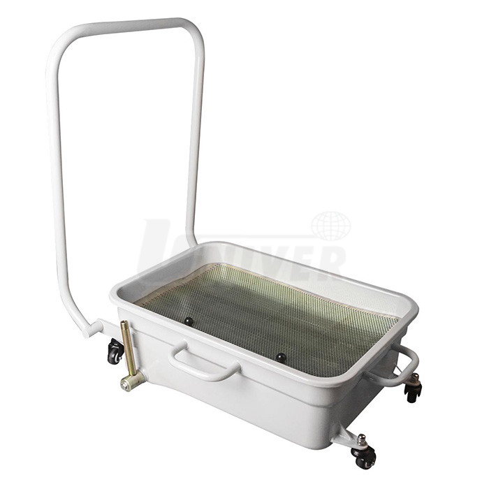 Pojízdná sběrná vana (65 l) pro vypouštění oleje a provozních kapalin je opatřena odtokovou mříží a kolečky.- odtoková mříž