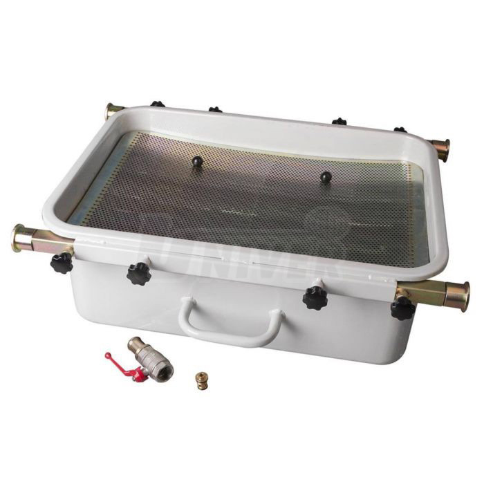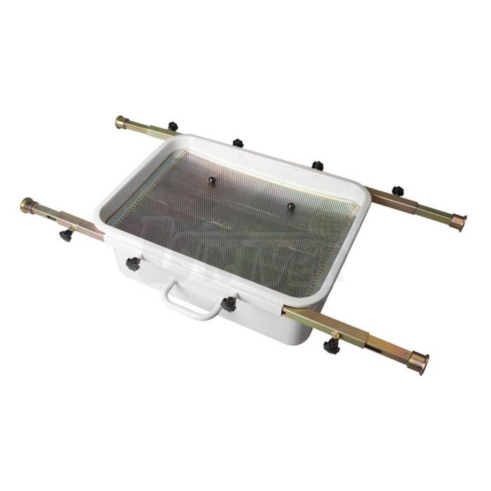 Pojízdná sběrná vana (65 l) pro vypouštění oleje a provozních kapalin je opatřena odtokovou mříží a kolečky.- odtoková mříž