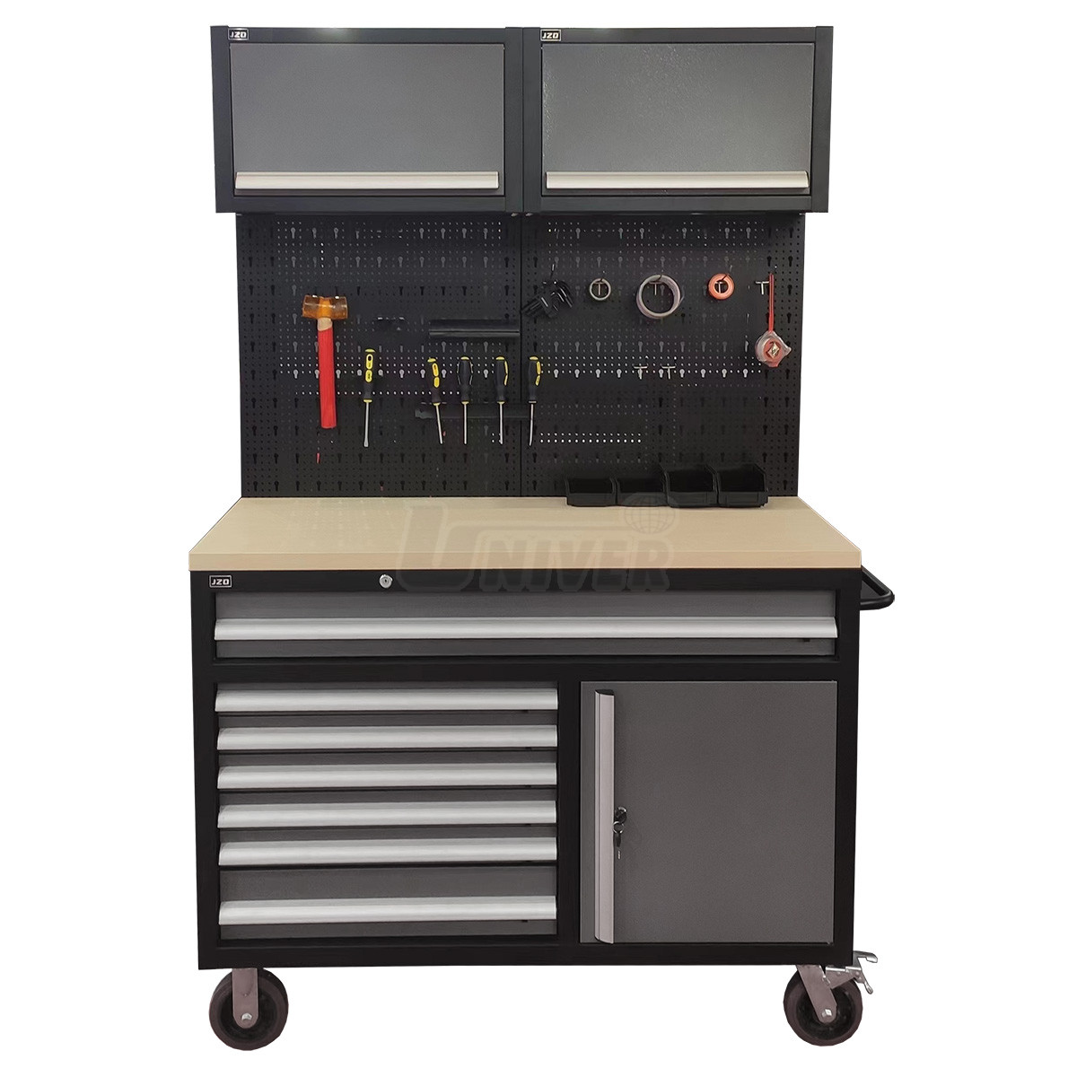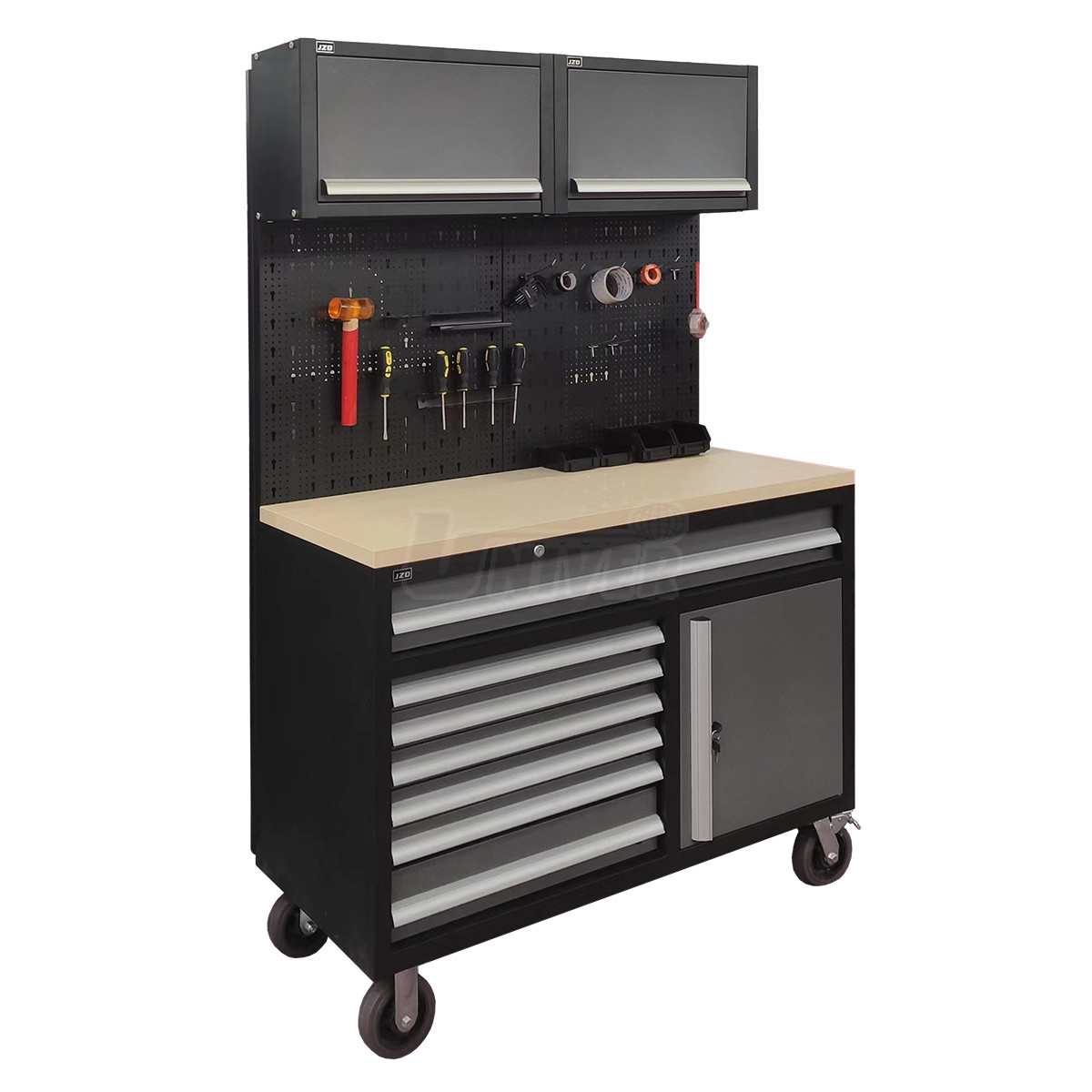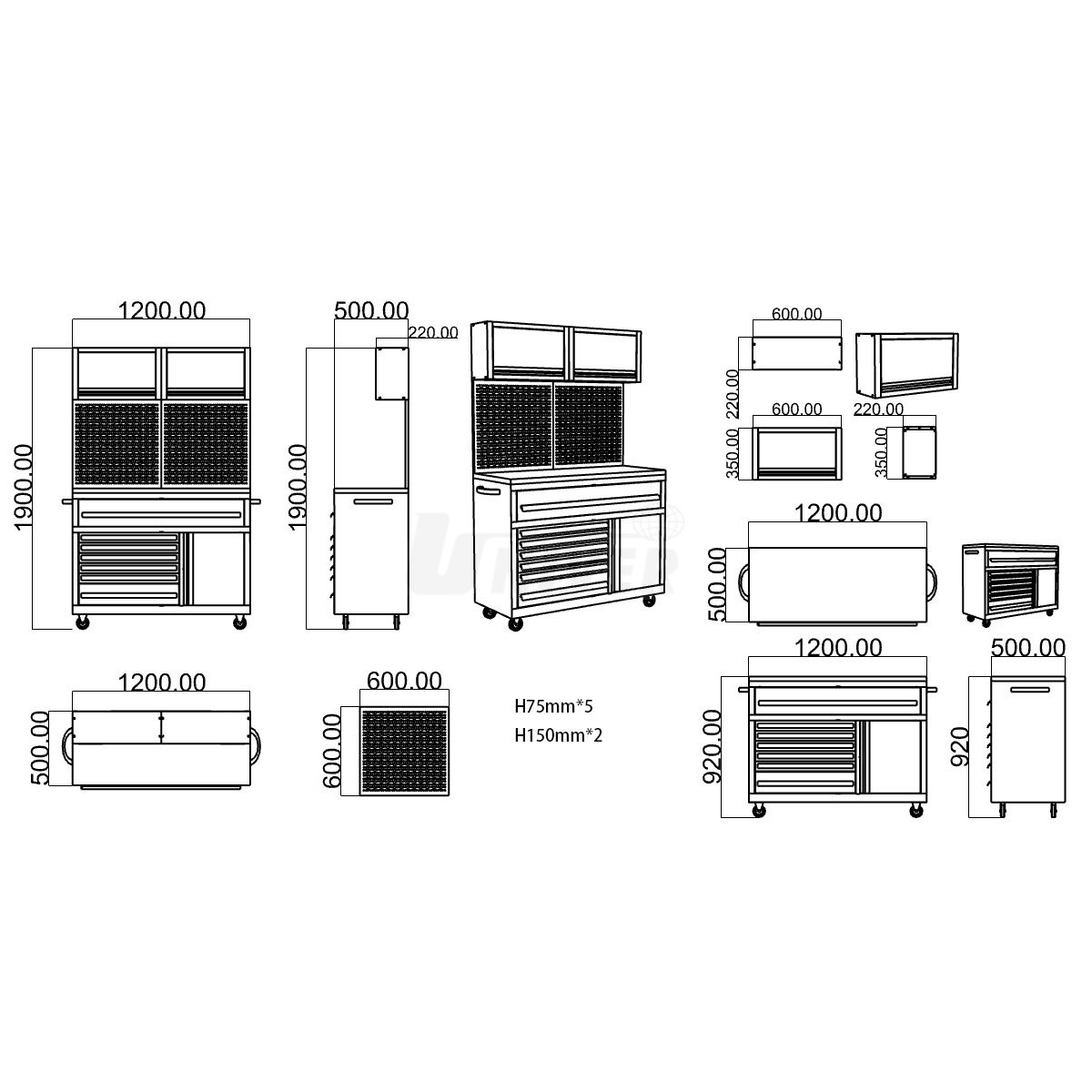 - spodná skrinka je rozdelená na ľavú časť so 7 ľahko výsuvnými zásuvkami s nosnosťou 40 kg na ručné náradie (5 zásuviek dolných 75 mm, 2 zásuvky horné 150 mm) a pravú časť s dvierkami