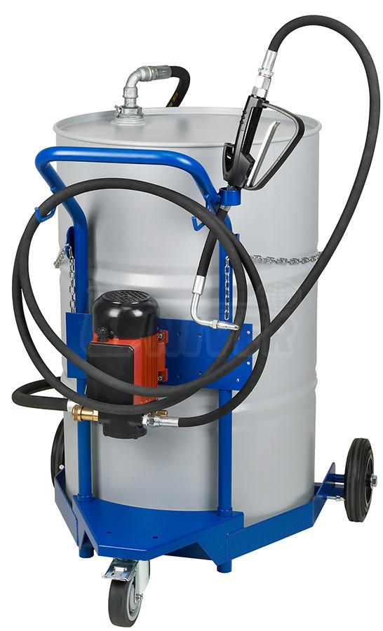 Pojízdné plničky olejů (až do SAE 90) s bočním elektrickým čerpadlem 230 V určeným pro sudy 200/220 l, s výdejní hadicí a pistolí, a s vozíkem na sudy.- elektrické čerpadlo zubové samonasávací 230 V, 500 W, 10 l/min je upevněné k držáku a příčné spojnici ve střední části rukojeti vozíku, nízká úroveň hladiny hluku