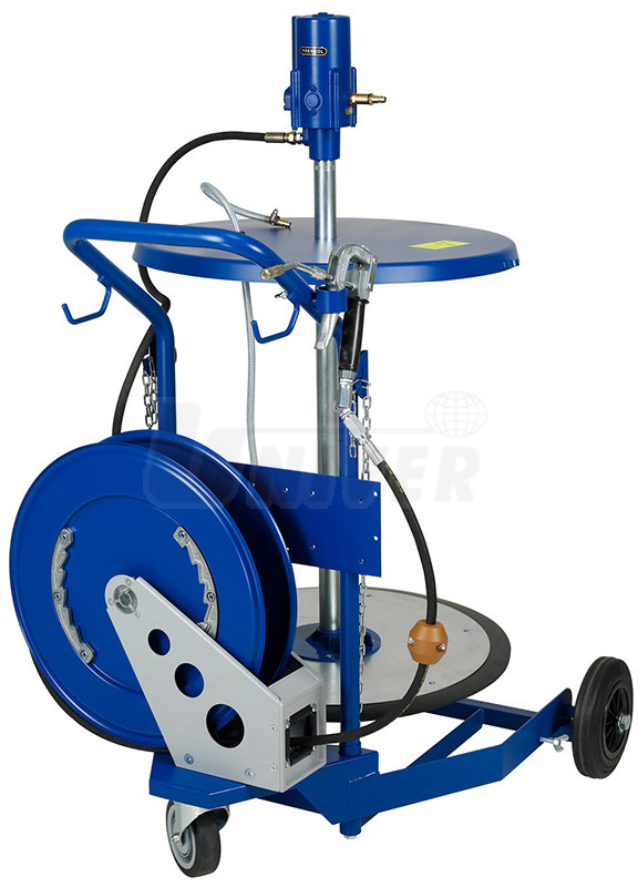 Pojízdný pneumatický mazací přístroj pro plastická maziva až do klasifikace NLGI 2 v sudech 200 kg s čerpadlem 50:1, navijákem s výdejní vysokotlakou hadicí a mazací pistolí.- uplatní se zejména v autoservisech, při servisu stavebních a zemědělských strojů, servisu armádní techniky, v průmyslu, údržbě atd.