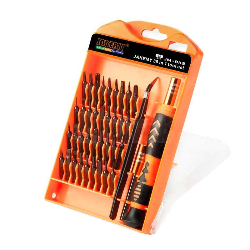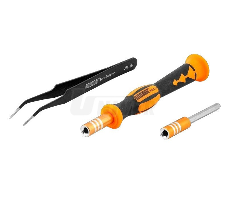 Mikro šroubovák se sadou 36 vyměnitelných bitů (H4 x 28 mm), s prodlužovacím nástavcem (60 mm) a s antistatickou pinzetou (118 mm) se zahnutými konci čelistí v plastové závěsné krabičce.- precizní magnetický šroubovák s ergonomickým tvarem a s protiprokluzovou povrchovou úpravou dl. 155 mm s koncovkou pro nasazení různých bitů