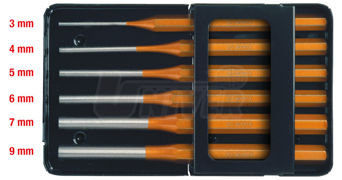 6-dílná sada vyrážečů závlaček / průbojníků různých průměrů, v praktické plechové úložné skříňce.- materiál: speciální chrom-molybdenová ocel