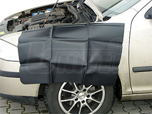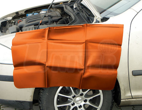 Speciální přehoz na přední blatník má velikost 600x800 mm. Pro jeho bezpečné uchycení slouží dva ploché pásové magnety. Přehoz je tedy držen v celé jeho šířce. Bezpečně chrání tuto část karosérie proti poškození v důsledku práce mechanika. Přehoz je vyroben z materiálu (vně koženka), který zabrání, aby došlo k poškození laku i při nešetrnějším kontaktu.