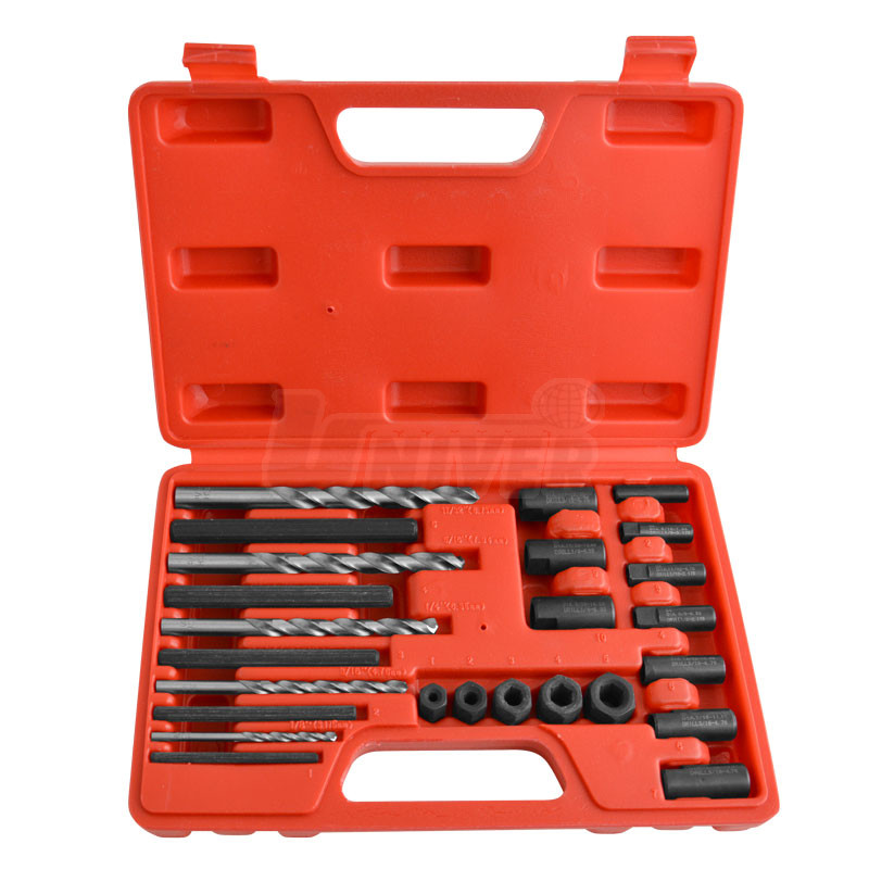 25-dílná sada přípravků pro vyšroubování ulomených nebo zarezivělých šroubů a čepů M5 až M16 v praktickém plastovém kufříku.- kompletní sada sestávající z přípravků / vytahováků pro vyšroubování ulomených šroubů a čepů, HSS-vrtáků a vodicích pouzder vrtáků