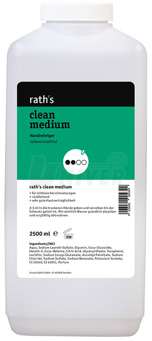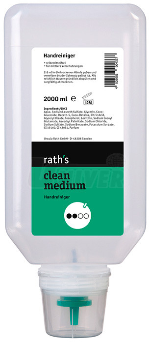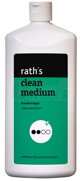 Po skončení práce se na suchou nebo zvlhčenou pokožku dá cca 2-3 ml (množství velikosti lískového ořechu) přípravku a ten se s pozvolným přidáváním vody v rukách roztírá a uvolňuje špínu. Potom se ruce opláchnou bohatě vodou a pečlivě vysuší. Při silně ulpívajících nečistotách se tento postup zopakuje nebo se použije přípravek rath´s clean intense. rath´s clean medium obsahuje kombinace tenzidů s velmi dobrými dermatologickými vlastnostmi. Produkt čistí citlivě, šetrně, ale účinně. Speciální substance zajišťují dobrý zpětný masticí efekt a omezují vysychání pokožky. Neutrální hodnota pH (cca 6,5) stabilizuje kyselý ochranný plášť pokožky. Přípravek má decentní, lehkou vůni. Skladovací podmínky: běžná pokojová teplota 0°C až 25°C. Trvanlivost (neotevřené): 30 měsíců. rath´s clean medium je minimálně z 90 % biologicky odbouratelný. Pro čistý a úsporný výdej se dodávají kvalitní dávkovače.