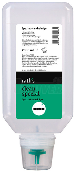 Po ukončení práce se na ruce dá cca 1-2 ml (množství poloviny velikosti lískového ořechu nebo celého) přípravku a ten se v rukách pečlivě roztírá až se veškerá nečistota uvolní. Potom se ruce při postupném přidávání vody dobře umyjí a osuší. Při silně ulpívajících nečistotách se tento postup zopakuje. Skladovací podmínky: teplota 0°C až 25°C. Trvanlivost (neotevřené): 30 měsíců. rath´s clean extra je biologicky odbouratelný.