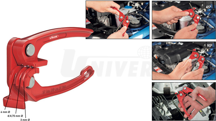 Klešťový nástroj pro snadné ohýbání měděných, mosazných, hliníkových trubiček a trubiček z měkké oceli. 3 ohýbací oblouky pro trubičky Ø 3 mm, 4/4,75 mm a 6 mm.