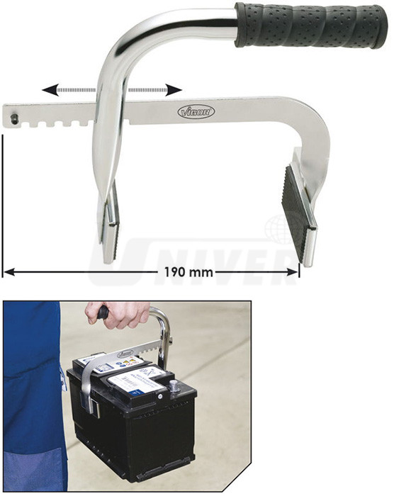 Přípravek pro snadné přenášení baterií má nastavitelné rozpětí držáku/opěrných plošek až do 190 mm a praktickou rukojeť.