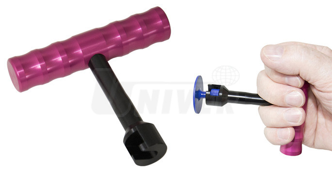 - speciální přípravek tvaru T s koncovkou pro uchycení a vytahování nalepených plastových vytahovacích adaptérů při vyrovnávání důlků a promáčklin karosérií
