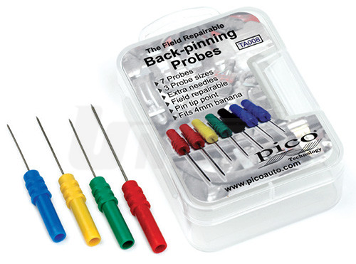 4-dílná sada zkušebních hrotů (červený/zelený/žlutý/modrý), které umožňují proniknout pod izolaci vícekolíkových konektorů a měřit signály bez porušení izolace kabelů nebo bez rozpojení konektoru. Průměr připojovacího pouzdra 4 mm.