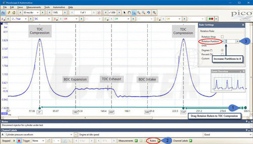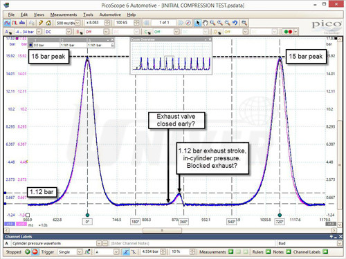 První měřicí rozsah -1 až 34,47 bar je určený pro testy komprese ve válcích při startování i v provozu. Umožňuje identifikaci kompresních problémů a zjištění problémů nastavení rozvodů (např. přeskakování rozvodového řemenu, vytahaného rozvodového řetězu apod.), což hraje velkou roli především u vícevačkových motorů, které nemají snímač vačkové hřídele na každé vačkové hřídeli.