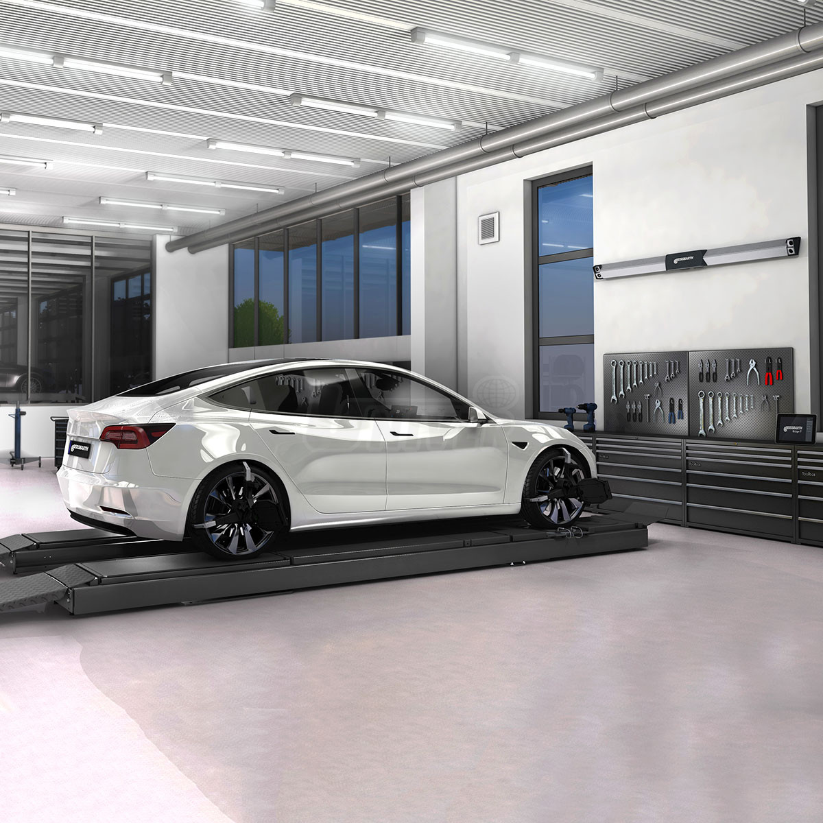 Přístroj 3D pro měření geometrie kol v provedení jako stavebnicová verze pro montáž měřicího nosníku na stěnu, s bezkabelovým přenosem dat a s ovládáním tabletem.- vychází ze stávající platformy Beissbarth Q.Lign, kdy webová technologie nahrazuje obvyklou pojízdnou skříň s PC