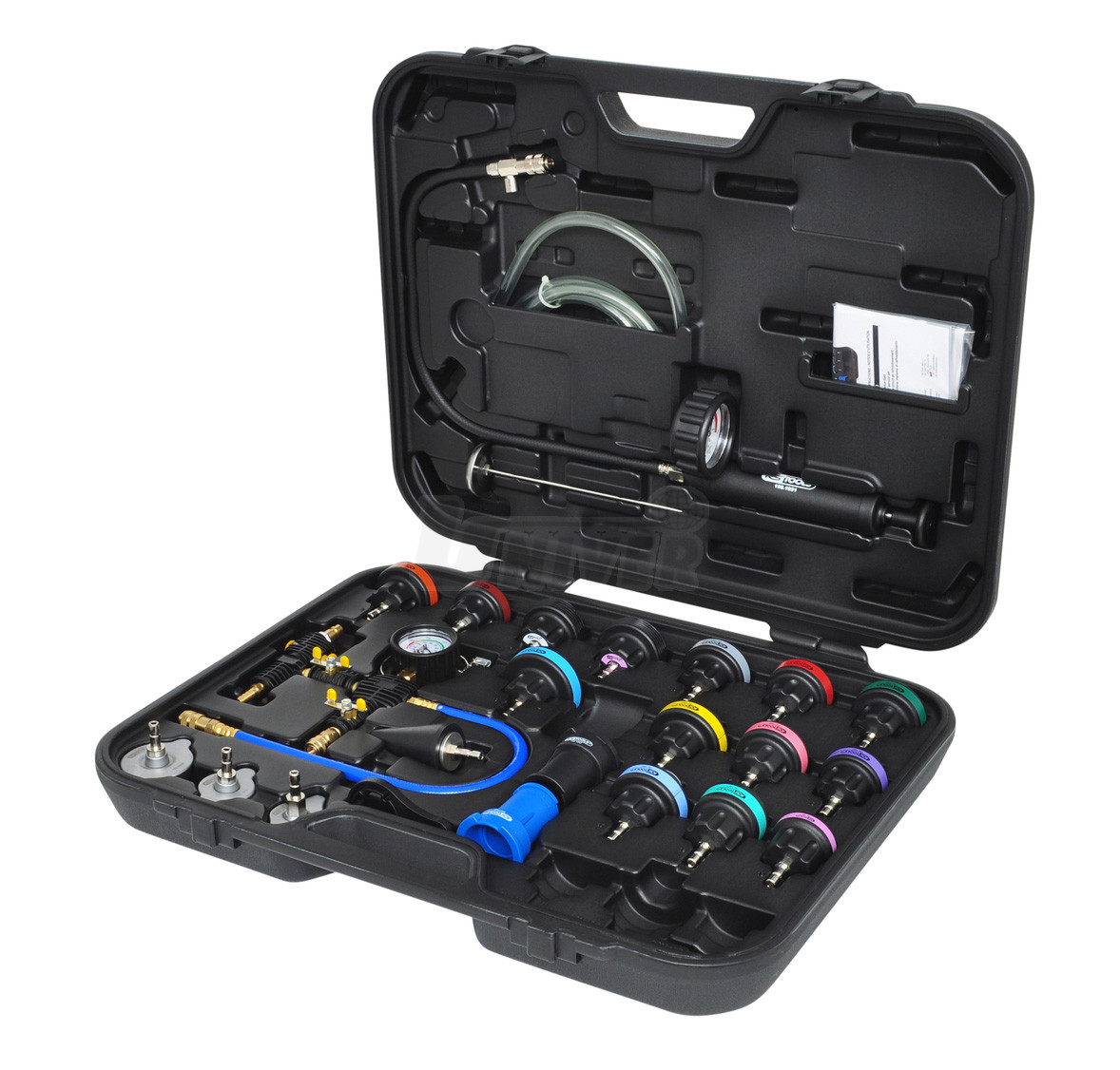 Přístroj pro zkoušení chladicích systémů a vyhledávání netěsností v nich s ruční pumpou s tlakoměrem 0 - 2,5 bar, teploměrem a adaptéry.- ideální sestava k tlakové zkoušce chladicího systému a uzavíracích víček