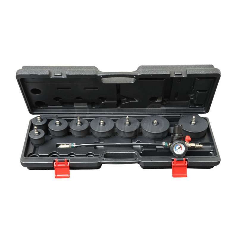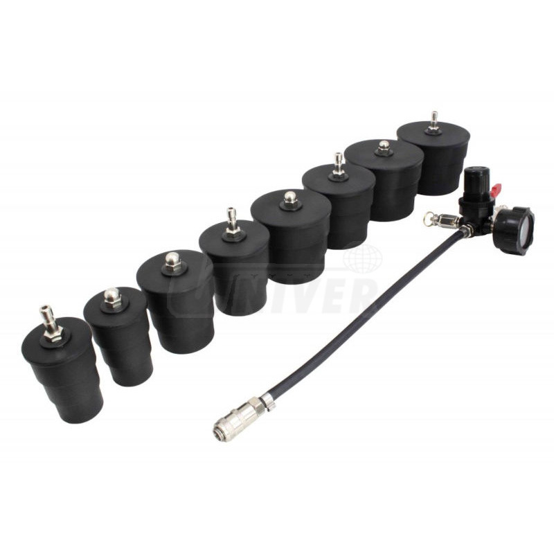 Sada obsahuje měřicí přístroj s tlakoměrem a integrovaným regulátorem pro lepší identifikaci netěsností a 4 páry kónických víček o průměru 35 mm až 90 mm.Použití přístroje/sady umožňuje natlakování celého turbo-systému a sacího traktu a tím snadnější i rychlejší zjištění netěsností.