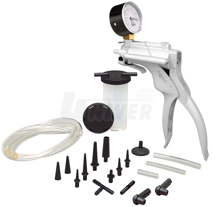 Přístroj pro vytvoření a měření podtlaku se skládá z ručního podtlakového čerpadla, schopného dosáhnout podtlak cca 0 - 1 bar, z přesného (pod)tlakoměru a řady připojovacích adaptérů, včetně nádobky 135 ml.Sada obsahuje: