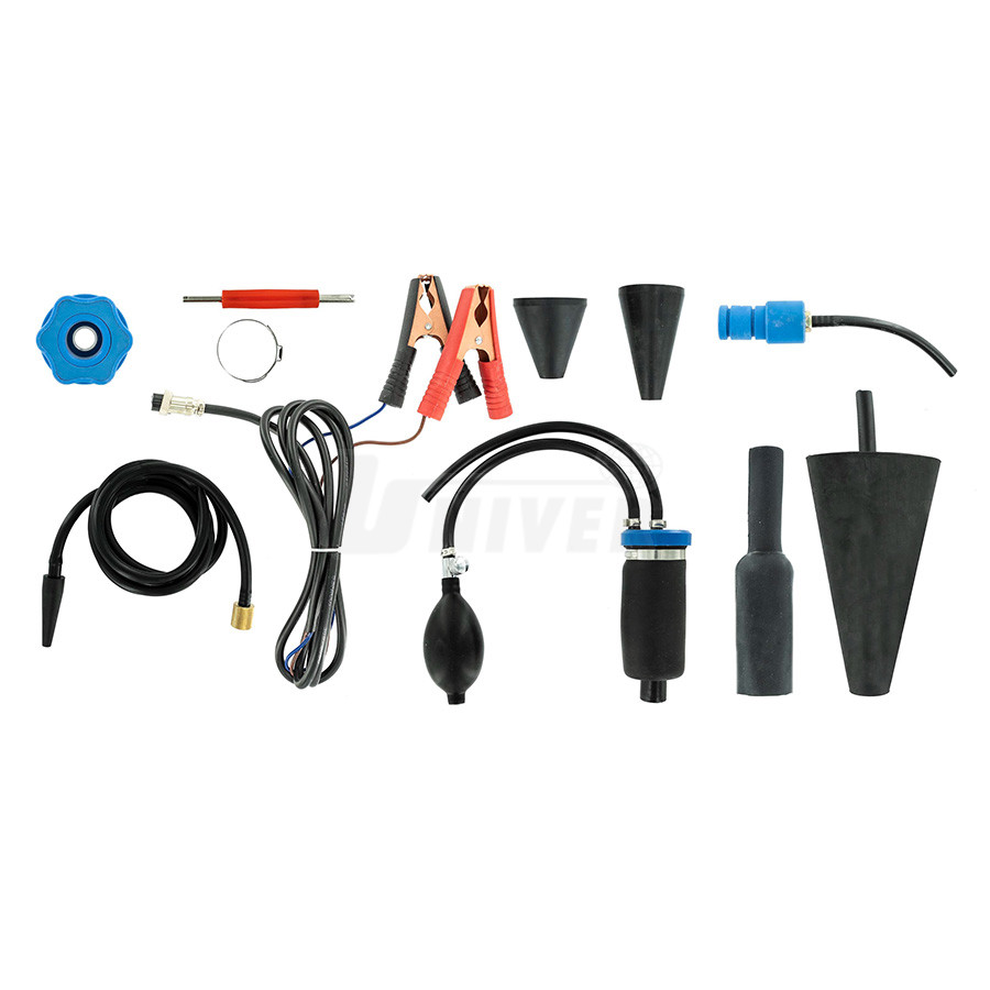 Detektor úniku kouře pro rychlé zjišťování míst netěsností potrubí, hadic, klikových skříní motoru, sacího a výfukového systému motorů, systému EVAP, systémů chlazení / EGR / palivových nádrží atd.- přístroj se naplní z nádobky s testovacím kouřovým olejem (250 ml, vystačí na cca 1 000 testů, lze použít i minerální olej USP nebo NF, lékařský / dětský olej) dodávané s přístrojem, odpojí se potrubí / hadička apod., které se mají testovat, přístroj napojený na 12 V produkuje kouř, který pomocí vestavěného čerpadla (není třeba používat externí čerpadlo) naplní potrubí a za pár minut už lze na základě úniku kouře zjistit místo netěsnosti