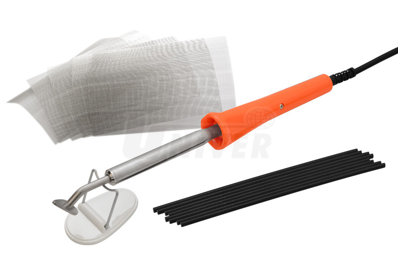 Přístroj pro opravy poškozených plastových dílů pomocí navaření nerezové ocelové vyztužovací síťoviny/mřížkové vložky a roztavené plastické opravné hmoty.- praktická a kvalitní oprava prasklin, trhlin, děr atd. plastových dílů s využitím speciálního nahřívacího přístroje, vyztužovacích mřížkových vložek ze síťoviny z nerezové oceli (150 x 115±1 mm) a tavných tyčinek (nanáší se podobně jako při měkkém pájení, používat lze např. 052956 - tavné polypropylénové tyčinky GYS)